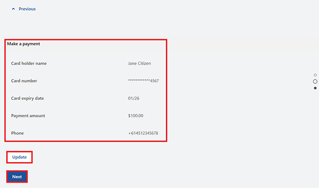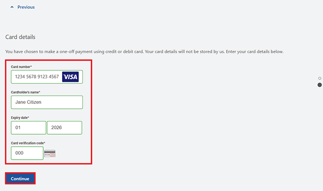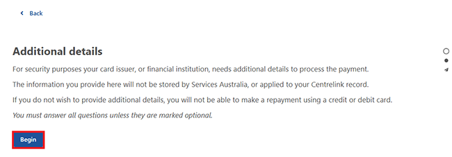 After you select submit, your card issuer or financial institution may ask you to complete additional actions to process your payment. Please don’t sign out of your Centrelink online account or close your browser window.
