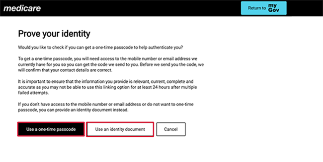 - access to the mobile phone number or email address registered with Medicare to receive a one-time passcode