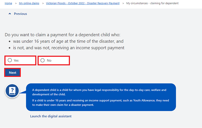 Select Yes or No if you want to claim for a child in your care. Then select Next.