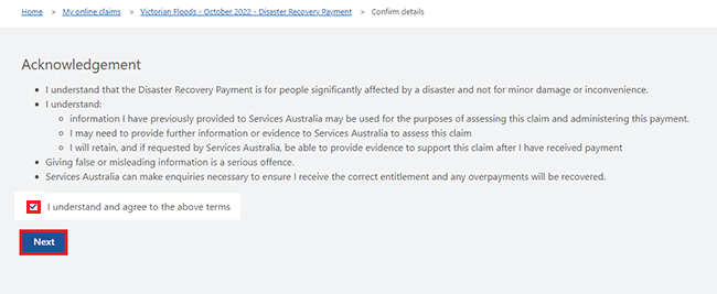 If all the details are correct, select Next to read your obligations and terms of the claim.