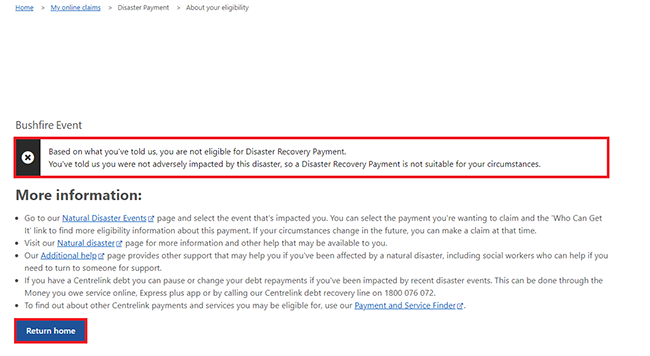 We’ll confirm a Disaster Recovery Payment is not suitable for your current circumstances. We’ll also suggest next steps.