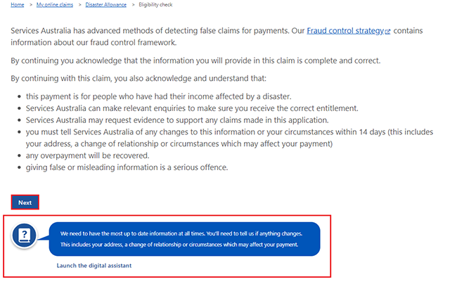 If all the details are correct, select Next to read your obligations and terms of the claim.