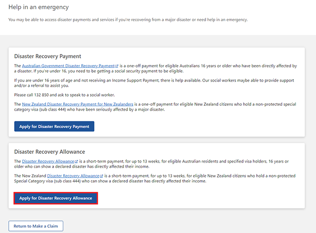 Read the information about Disaster Recovery Allowance. This claim is for those who’ve lost income as a direct result of the disaster. Then select Apply for Disaster Recovery Allowance.