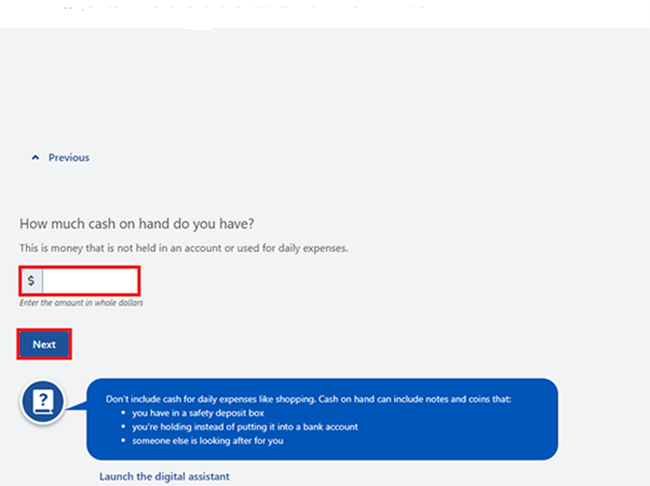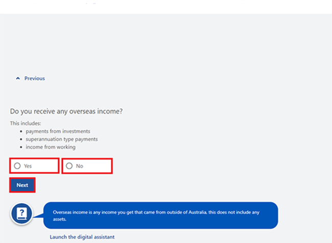 Select Yes or No to tell us if you’re getting a Department of Veterans’ Affairs income support payment. Then select Next.