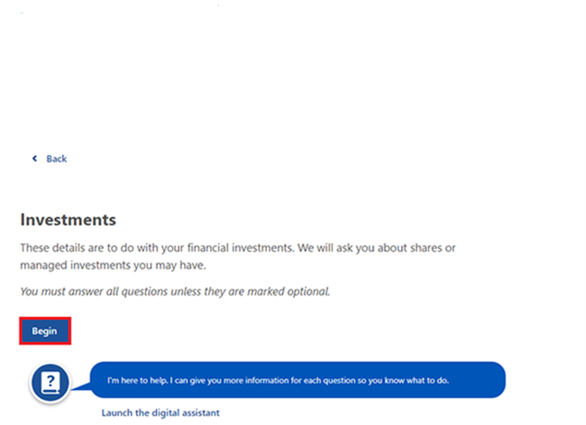 Answer more questions about employment by entering the information we ask for. We may ask you to give us proof of your investments, like share statements, when we process your claim.