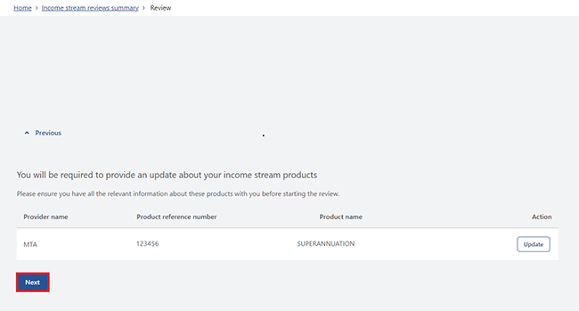 From your homepage, select the Complete your income stream review task. Then go to Step 2 to start your income stream review.