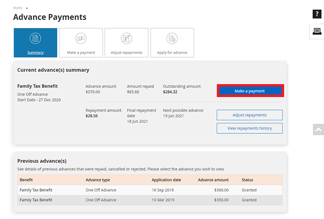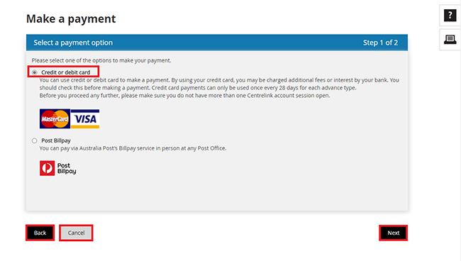 When you make a payment with a credit or debit card, you won’t be able to make another payment with a card for 28 days for this advance type. You can still make a payment at any Australia Post Office.