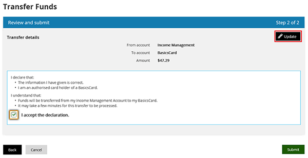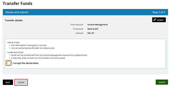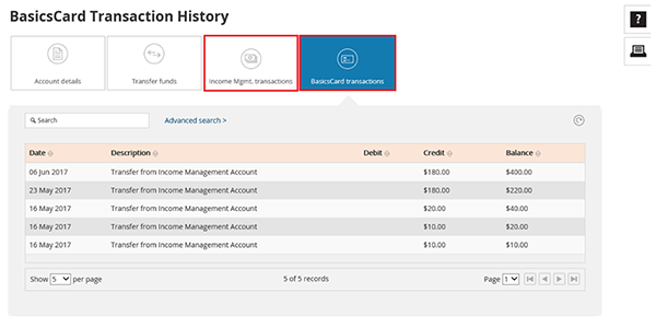 Select Transfer funds to move money between your Income Management account and BasicsCard.