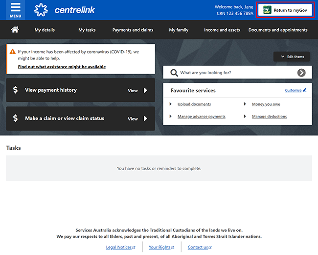 From your homepage, you can complete other transactions or select Return to myGov to go back to your myGov account.