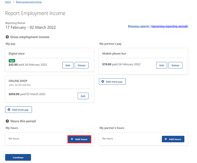 You may not need to report the hours worked. This depends on the payment type you and your partner get. If you don’t need to report hours worked, the Add hours option won’t show. You can select Continue to proceed.