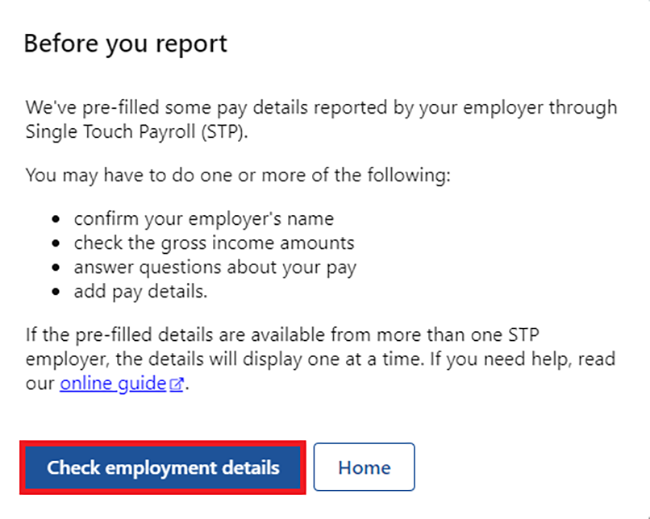A Before you report message will tell you there’s pre-filled employment information to check, if employment details are available from your employer.