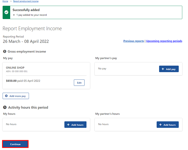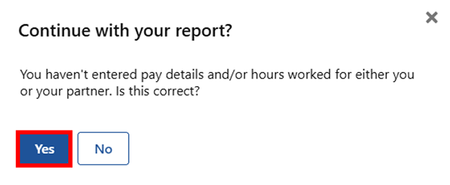 If you and your partner didn’t get paid any other employment income in your reporting period, and didn’t work any hours, select Continue.