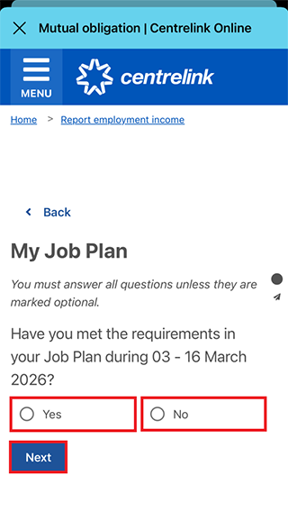 If you’re a job seeker managed by Centrelink, we’ll ask if you’ve met your Job Plan requirements for the reporting period.