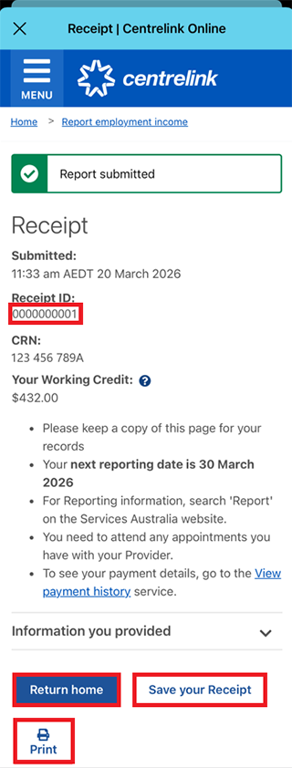 We’ll give you a receipt when you submit your report. Make a note of the Receipt ID for your records.