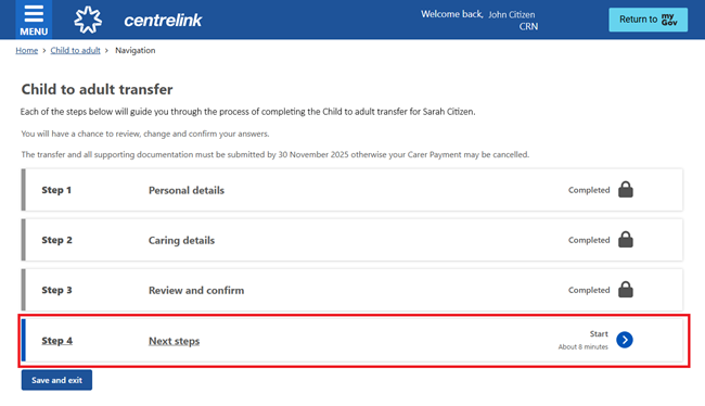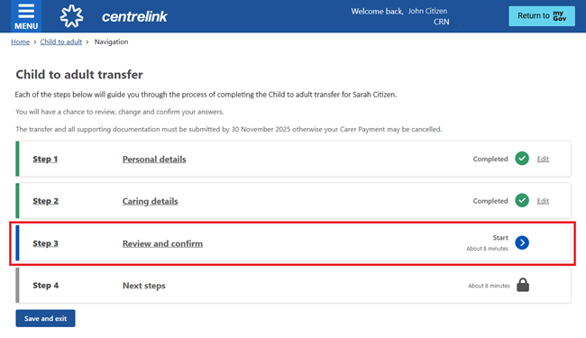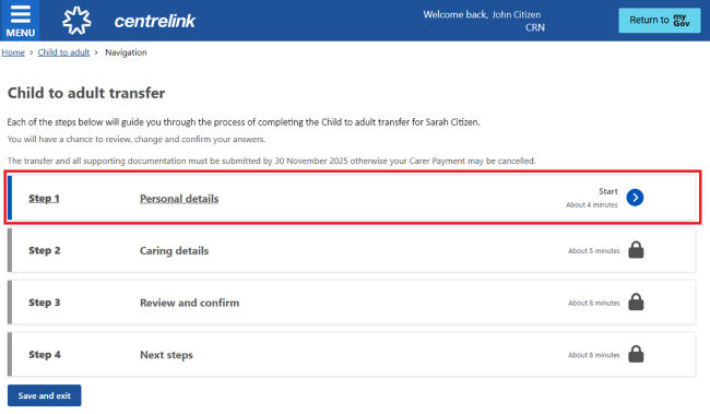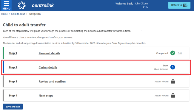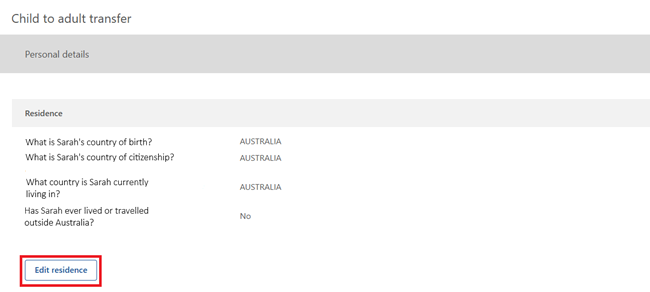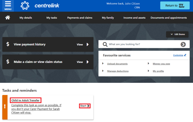 From the Child to Adult Transfer task and reminders, select Start. You can also access your Child to Adult Transfer task under Payments and claims and selecting Update circumstances.