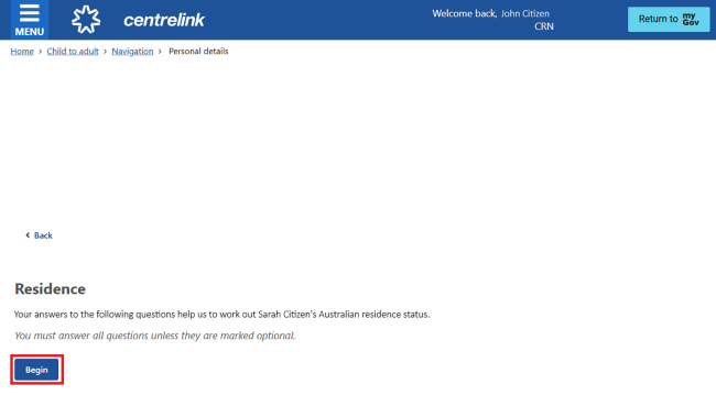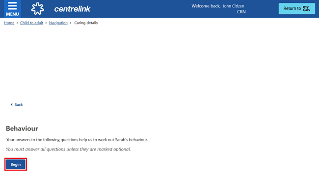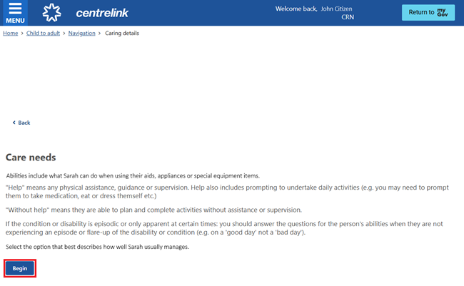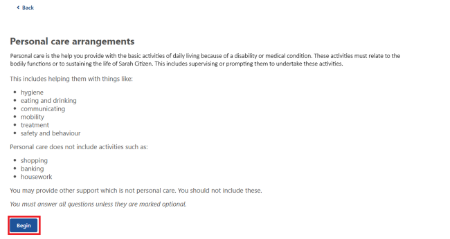 Answer all the questions on Personal care arrangements, by selecting Begin. Answer all questions then select Continue.