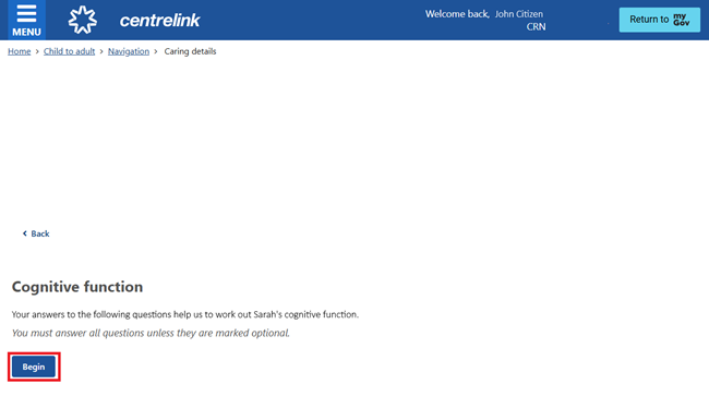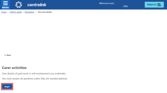 Answer all questions on Carer activities by selecting Begin, then select Continue.