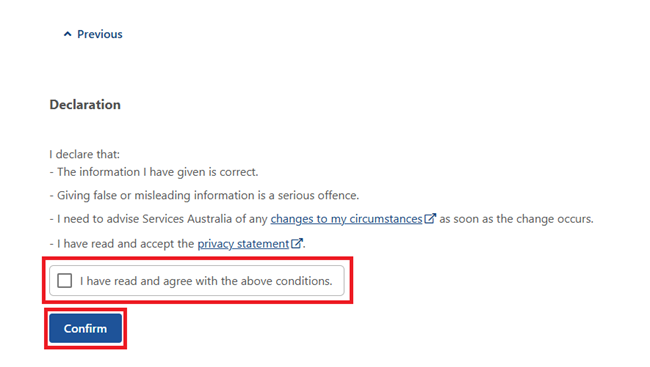 If you understand and agree with the declaration, tick the box I have read and agree with the above conditions then select Confirm.