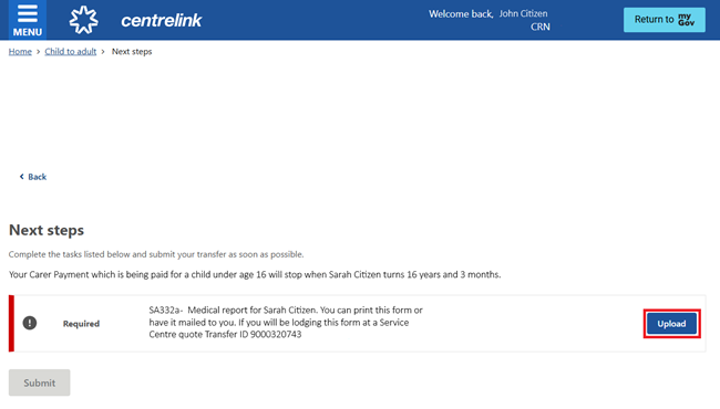If you are unable to upload your documents via your online account, you can take them to your local service centre. You will still need to select Submit in your online account to finish your Child to Adult transfer.