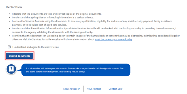 Read the Declaration. If you understand and agree with the declaration, select I have read, understand and accept the declaration, then select Submit documents.
