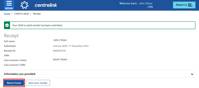 From your homepage you can complete other transactions or select Return to myGov to go back to your myGov account.