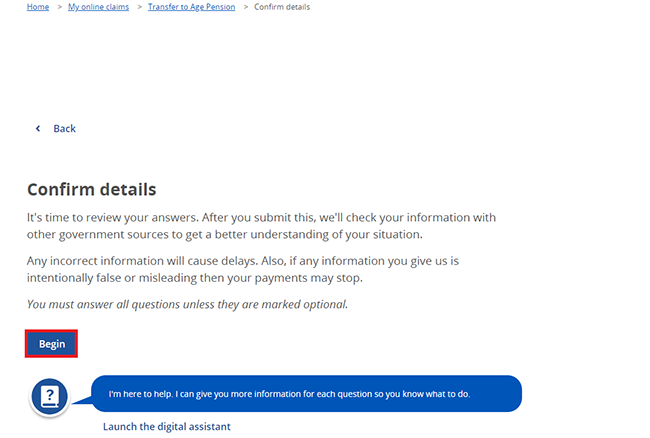We’ll ask you some questions to check if you may be eligible for Age Pension. To check your eligibility, select Begin.