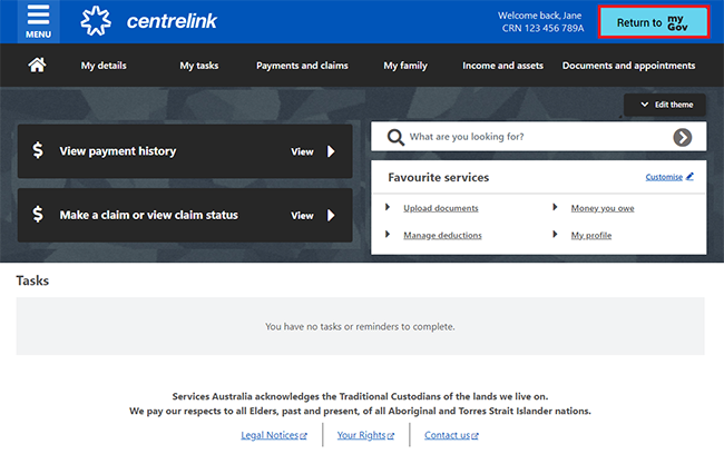 From your homepage, you can complete other transactions or select Return to myGov to go back to your myGov account.