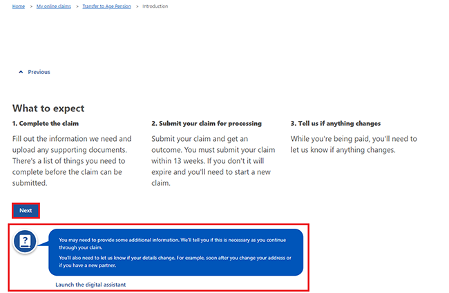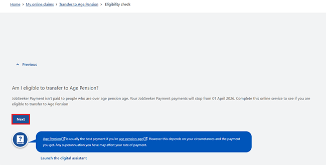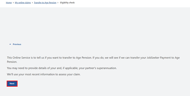 Based on your answers, we’ll let you know if you may be eligible to transfer to Age Pension.