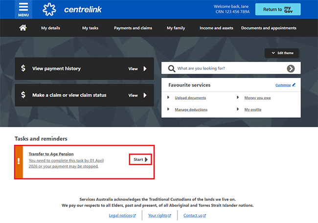 From your Centrelink online account homepage, select Start task in the Transfer to Age Pension task. This will take you to Step 2 so you can check your eligibility.