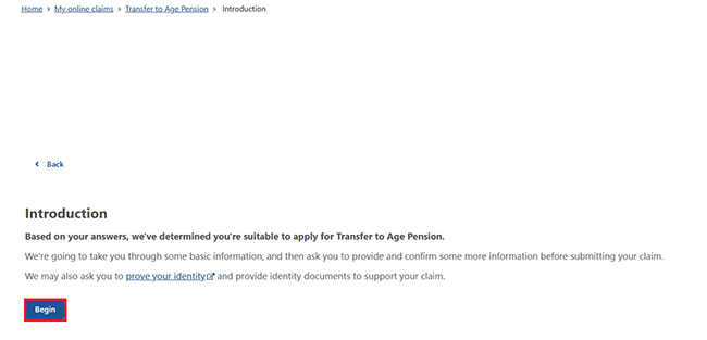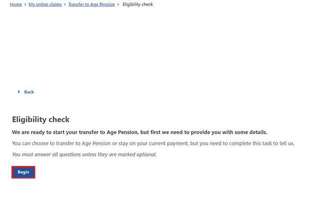 Select Begin to apply for a transfer to Age Pension.
