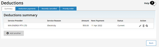 The Deductions Summary tab displays a summary of any current Centrepay arrangements that you have in place.