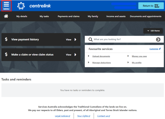Sign in to myGov and select Centrelink.
