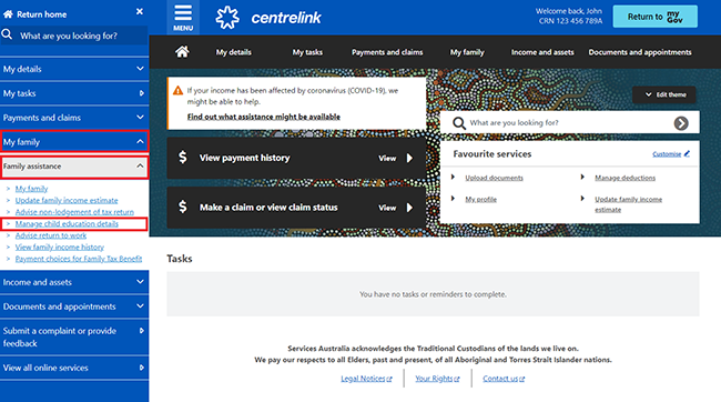 Select My Family, followed by Family assistance, and Manage child education details.