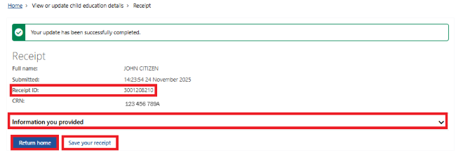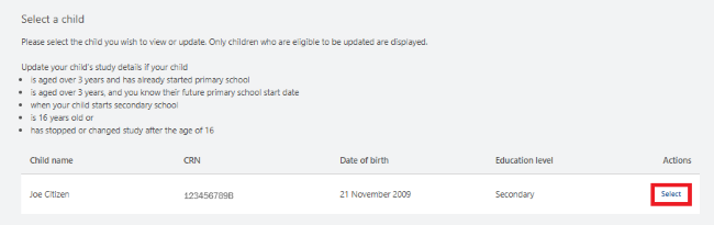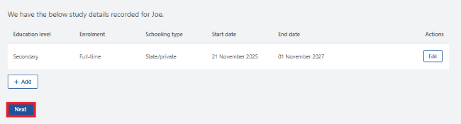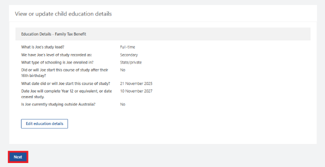 The next screen will show a summary of your child’s updated education details. Make sure the details are correct, then select Next.