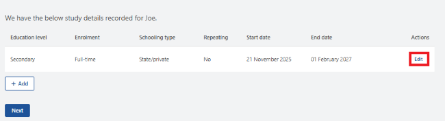 Select Edit to update your child’s existing study details.