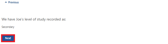 The next screen will show the level of study we have recorded. Select Next.