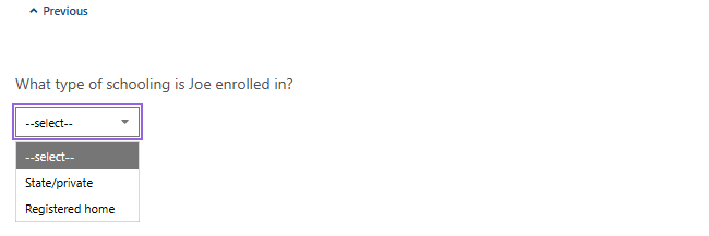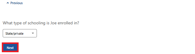 Select the type of schooling your child is enrolled in from dropdown menu, then select Next.