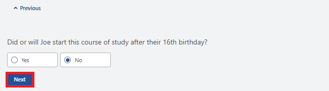 You’ll need to confirm if your child started the course after they turned 16. Select Yes or No, then Next.