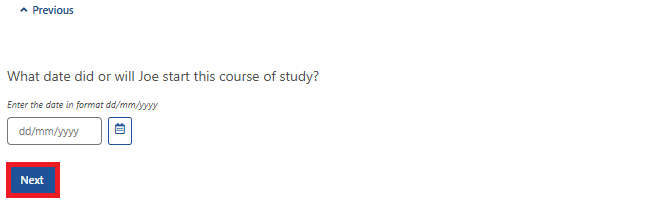 Select the calendar icon and choose the date your child started the course of study, then select Next. You can also enter the date manually as dd/mm/yyyy.