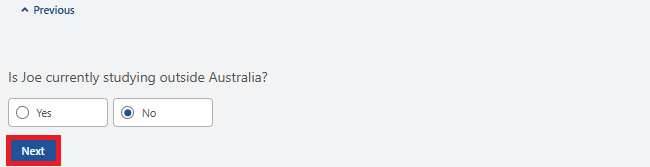 You’ll need to confirm if your child is studying outside Australia. Select Yes or No, then select Next.