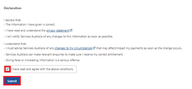 Read the Declaration. If you understand and agree with the declaration, select I have read and agree with the above conditions, then Submit.