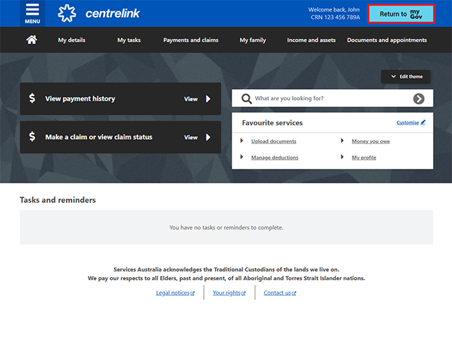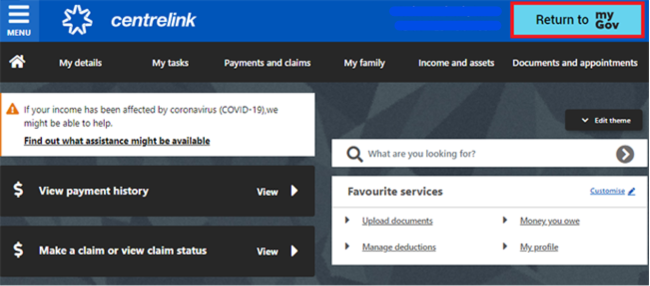 From your homepage, you can complete other transactions or select Return to myGov to go back to your myGov account.