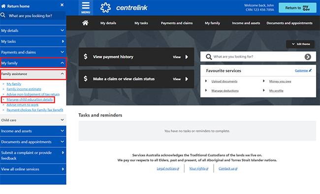 Select My Family, then Family assistance, and Manage child education details.