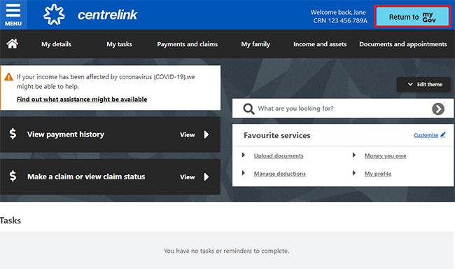 From your homepage, you can complete other transactions or select Return to myGov to go back to your myGov account.