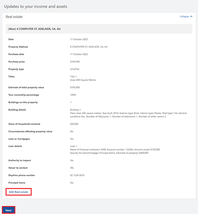 Review each section to check your details are correct. If you need to make changes, select Edit Real estate.