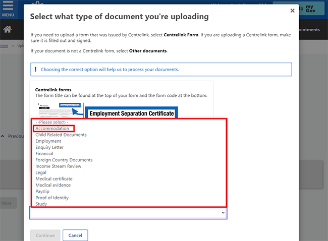 If you need to upload a Centrelink form, select Centrelink Form.