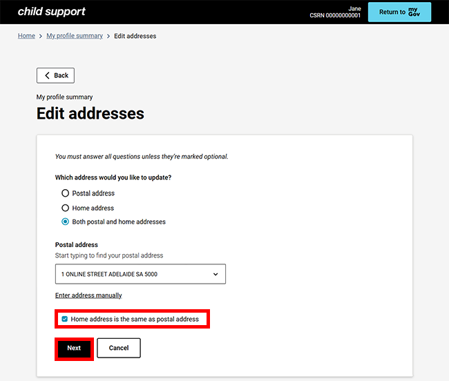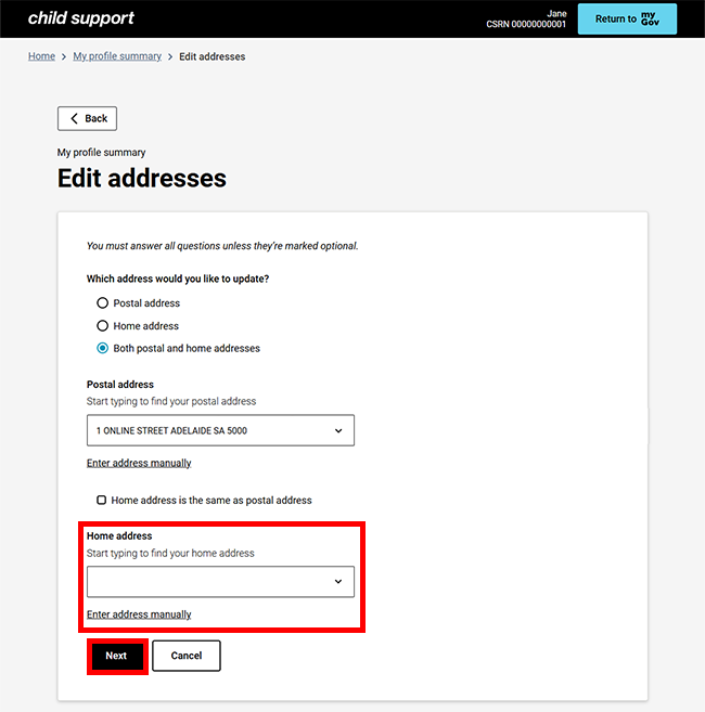 If your home address is different to your postal address, repeat the previous steps, then select Next.