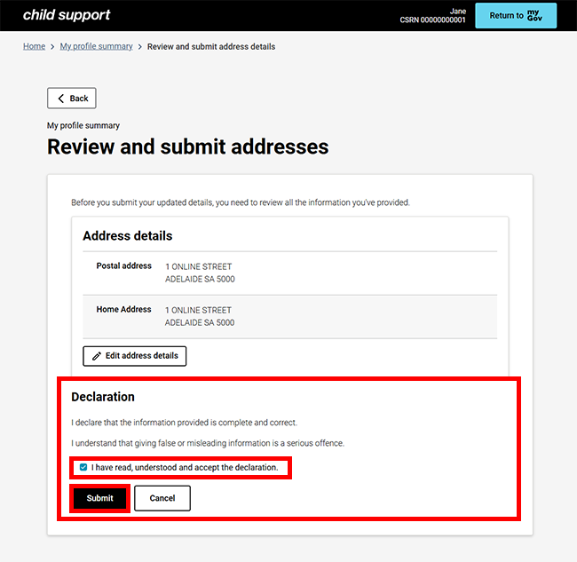 If all the details are correct, read the declaration. If you understand and agree with the declaration, select I have read, understood and accept the declaration. Then select Submit.