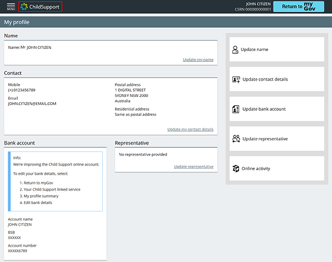 We’re redesigning the Child Support online account. Some things in your account will look different to what you’re used to. You can choose to access Update contact details by selecting either: