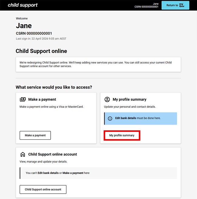 Step 1: get started with My profile summary in the redesigned Child Support online account